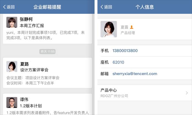 作为内部沟通的重要场景之一,在企业微信1.2版中,邮箱功能得到了极大的拓展,不仅更具开放性、支持全协议收发公司邮箱。而且来信的邮箱地址自动与公司通讯录匹配,能快速辨识发信人。