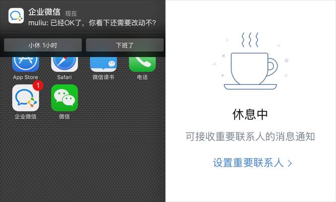 在1.2版本中,如当前不方便处理工作消息,可在接收新消息时很方便的设置“小休”或“下班了”。