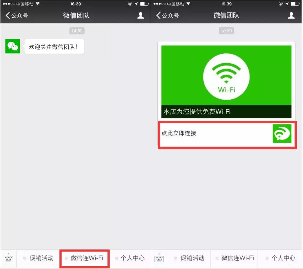 还在通过扫码连Wi-Fi?这就out了。因为“微信连Wi-Fi”公众号连网上线啦!现在用户只需在关注商户公众号后,直接在商户公众号菜单栏点击“微信连Wi-Fi”,或者点击公众号下发的连网消息,点击进入连接,即可连接Wi-Fi上网。