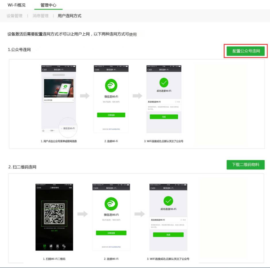 进入管理中心,选择“用户连网方式”,然后点击“配置公众号连网”。