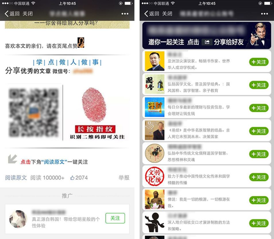 (2)公众号通过文章的“阅读原文”跳转到外链对批量公众号引导关注。 左图文章通过“阅读原文”引至右边引导关注页面