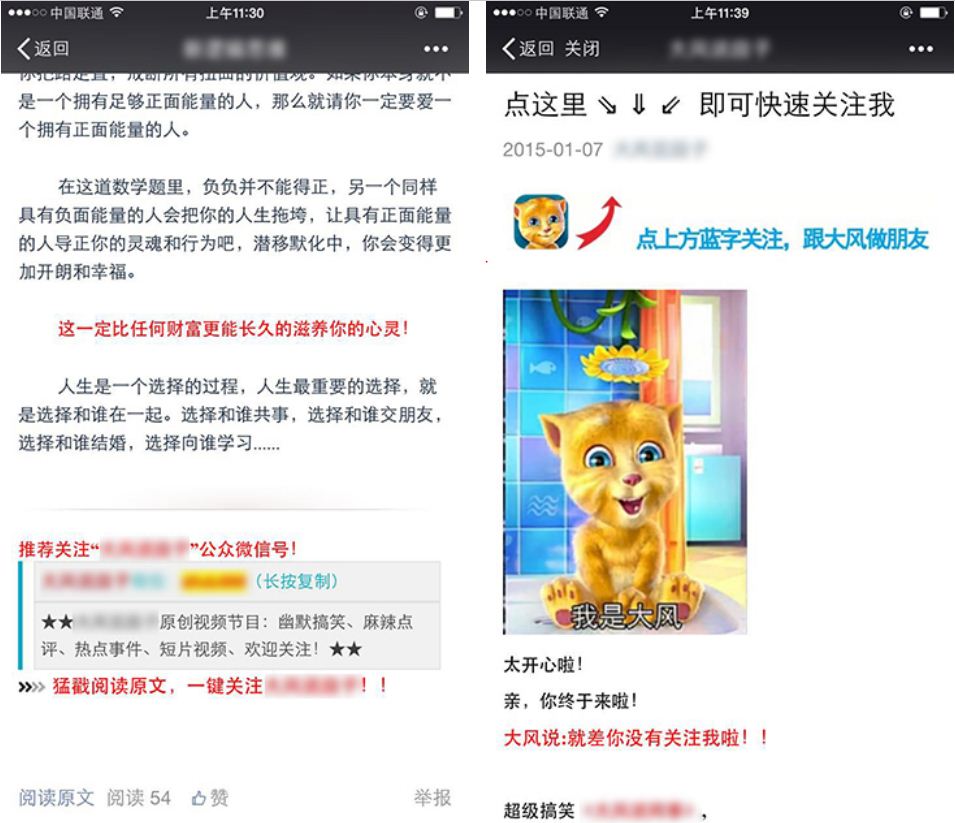(1)左图文章通过“阅读原文”引至右边引导关注页面